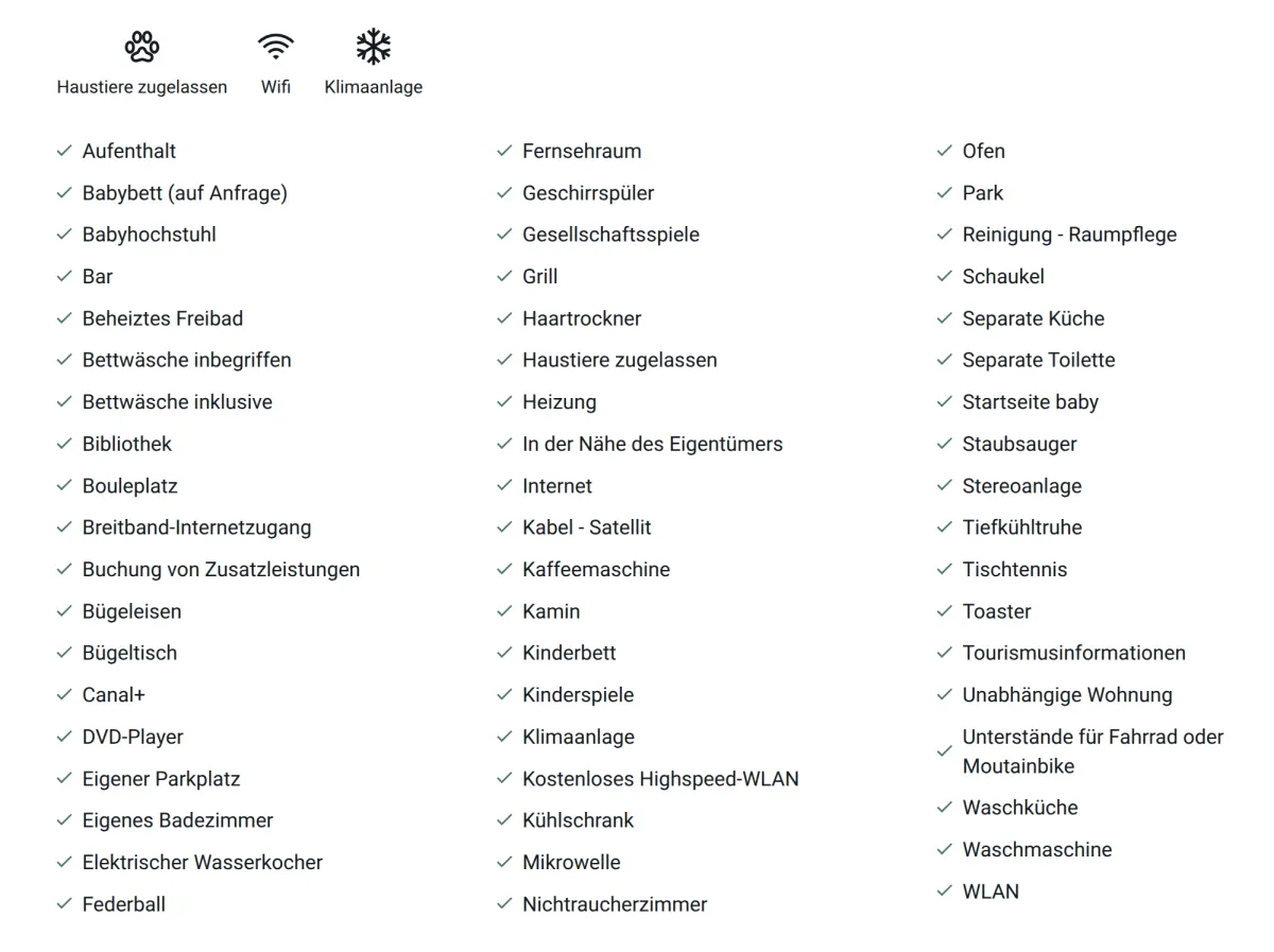 Sie erleichtert ihren Gästen das Leben durch die Bereitstellung eines Unterstellplatzes für Autos und Fahrräder, eines mit einer Bibliothek ausgestatteten Büros mit Glasfaser- und Highspeed-WLAN-Anschluss. Ihr Ferienhaus akzeptiert Haustiere, was den Familienaufenthalt noch geselliger macht.